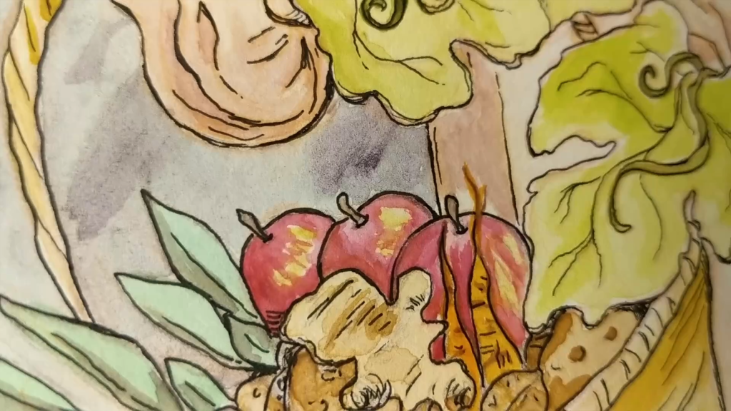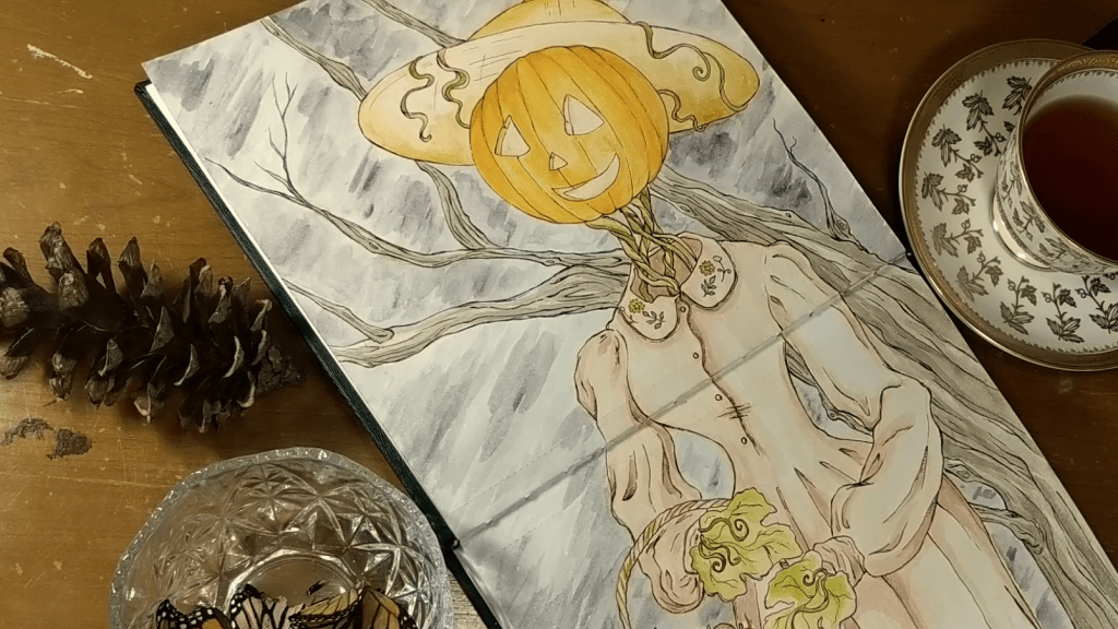 A few years ago, I dreamed up Miss Pumpkin, a sort of personification of Autumn Spirit. Painting her portrait reminds me that there is so much to be thankful for as we reap the alms of the Earth. Apples, pumpkins, the flurry of colour in the trees. Crisp air, the smell of crunchy leaves, a warm sweater, a steaming cup of tea. Our loved ones. Even and especially if times are gloomy for you right now, I hope you can find time to rest and enjoy all of the wonderful things you already have.
