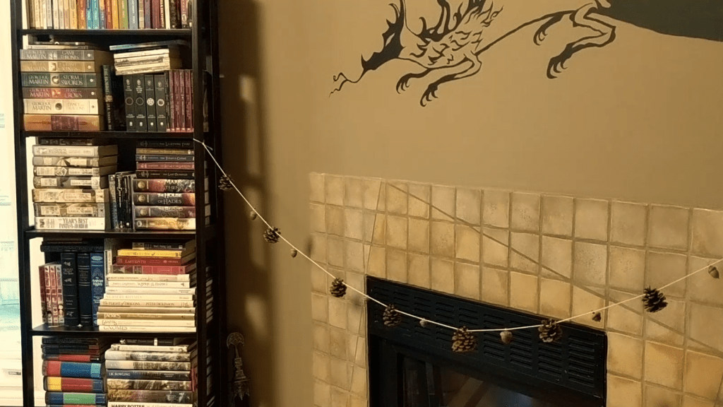 I had plenty of leftover acorns and pinecones so I decided to make some garland to hang over my hearth. I simply strung a length of cotton thread around the tops and made sure there was a little length on each side (any string, yarn or twine will do). I’ll probably keep this up year-round.